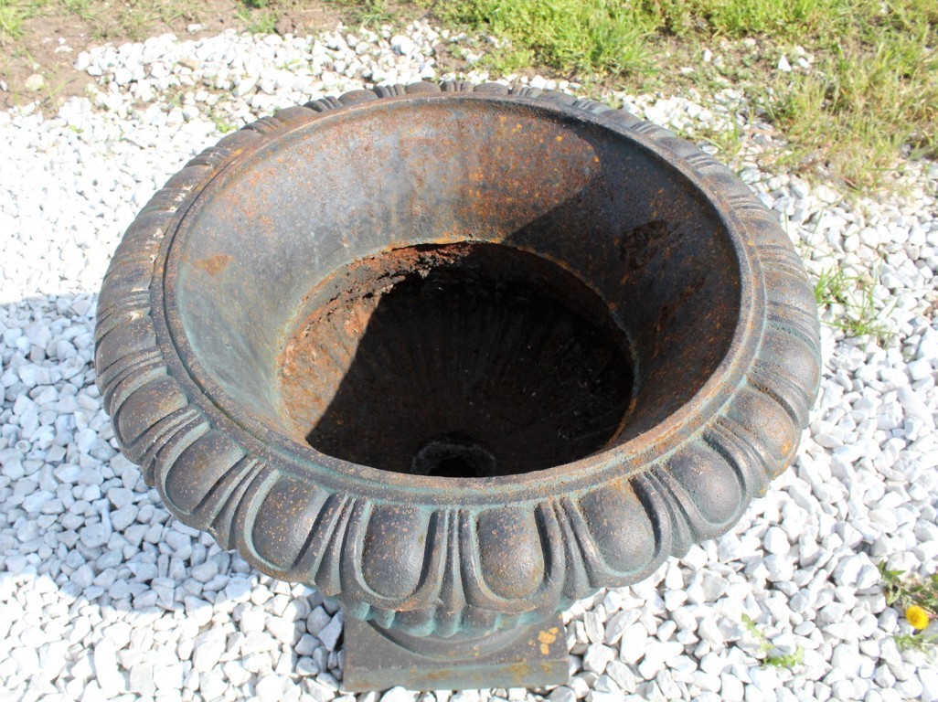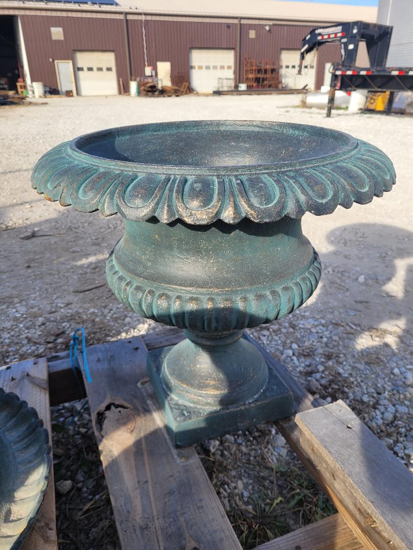 The Cast Iron California urn flower planter is one of our most popular planting containers because of its size and beautiful detail. It measures 23" tall by 23" diameter with an 11" square foot. The inside measures 13" by 11.5" deep. Foot measures 11" square. Weighs 95 lbs.