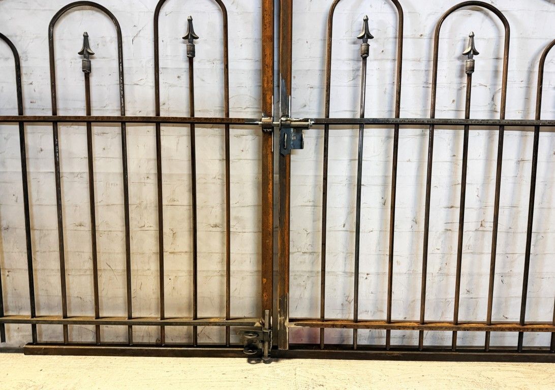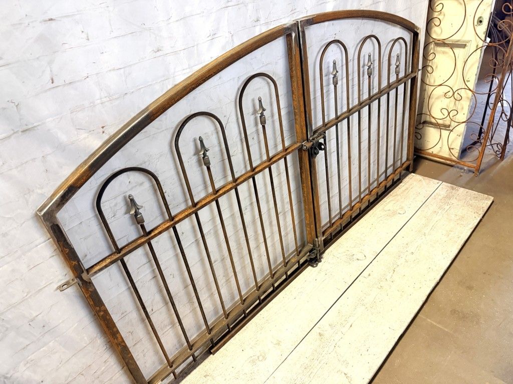 Our talented welders in central Illinois craft this wrought iron Missoula gate tailored to your opening. This pattern features a center divide or double gate, spanning 7 feet for easy access for lawn mowers and other gear. The sturdy frame is constructed from 1.25" square tubing, ensuring durability and strength.
