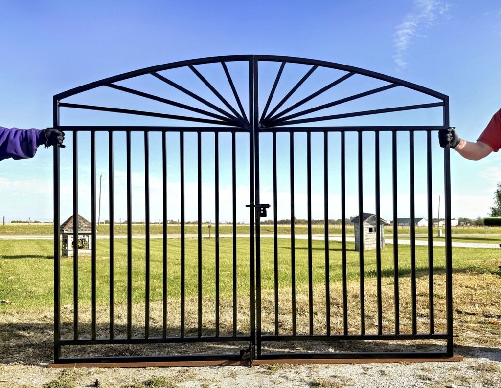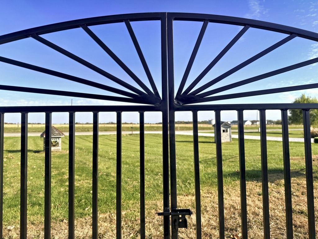 Our Sunburst Center Divide driveway gate will work with many architectural styles. This entrance will be around 8' wide and at the sides the height installed is 5' tall. It is constructed from 1" square metal tubing.... Very Strong.
