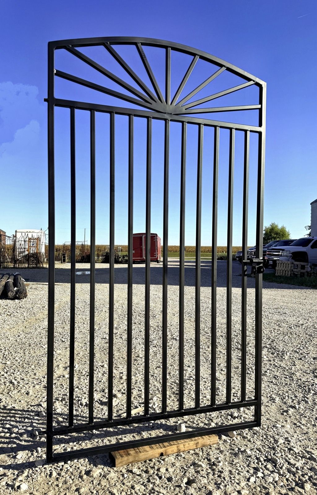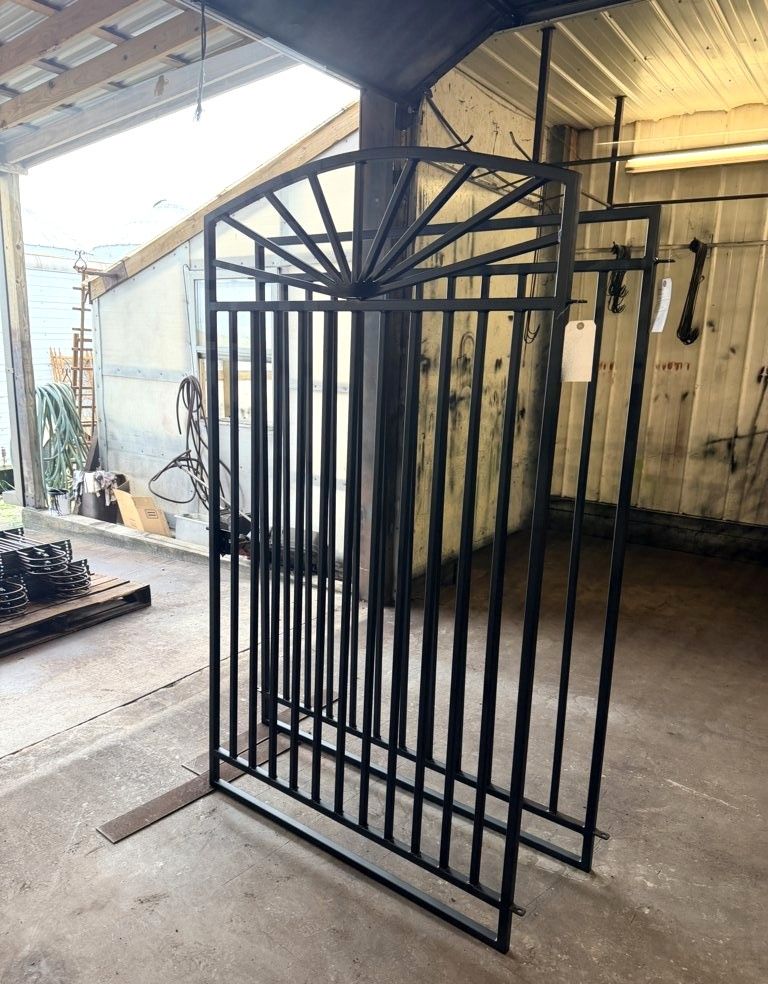 Our welders are always constructing new wrought iron gates. This huge Sunburst gate is 6' tall installed. The top section is all about angles and shows well out in the landscape. Keep in mind we custom make all our gates so size color and style can be changed just for you. The frame is welded 1" square tube for added strength.