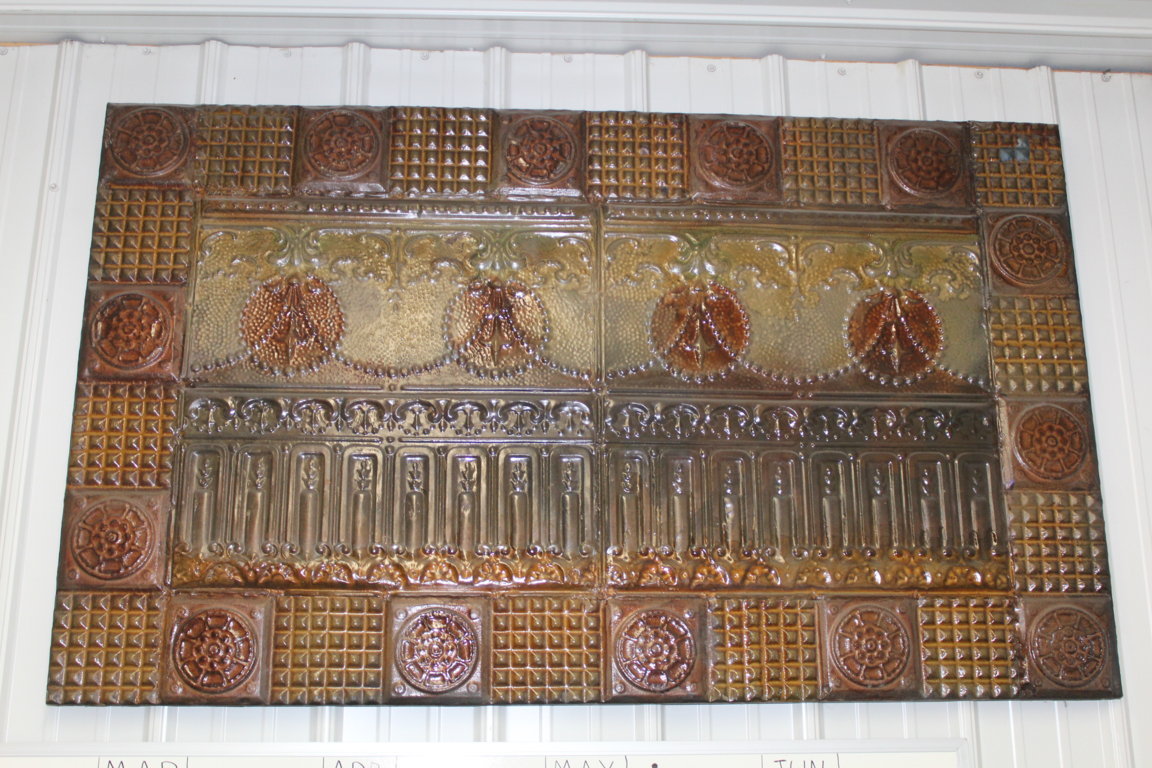 This cinnamon colored handmade old vintage ceiling tin piece of art work, made by Lori Daniels in Illinois, would make a wonderful looking decoration over your bed or on a wall.