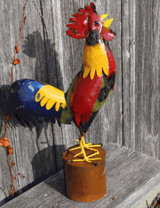 Set this rooster on a fence post and he will cock-a-doodle-doo for you. If you are a collector of chickens, he would make a good shelf sitter also. Measures 20" tall x 8" long x 4" deep.