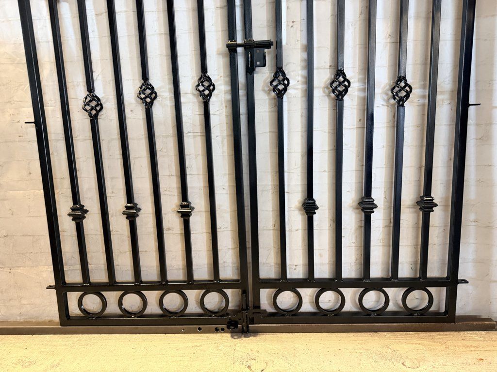This wrought iron center divide gate is the best of 2 gate designs. The Donovan is our most popular gate and we added the circle designs to top and bottom.