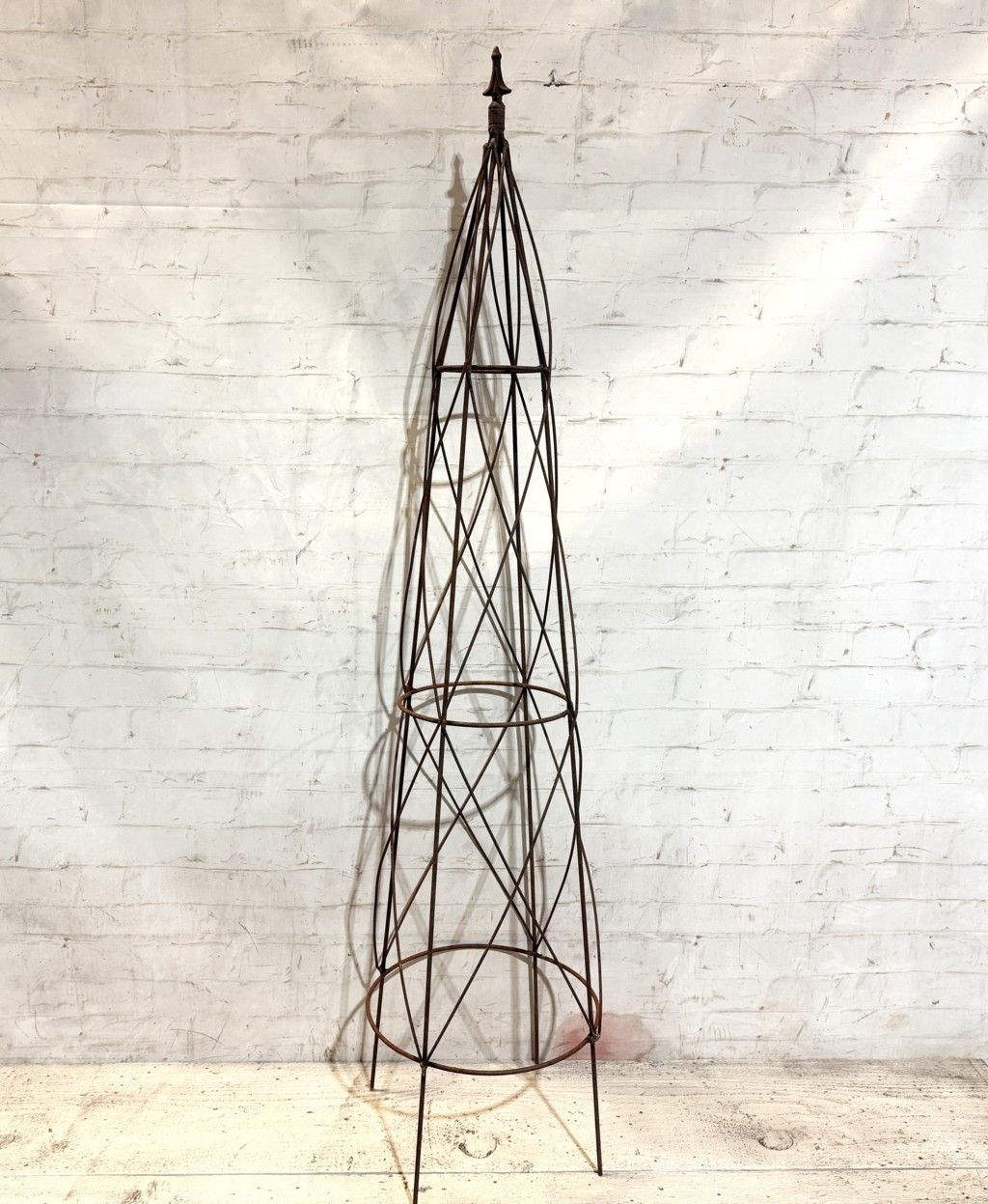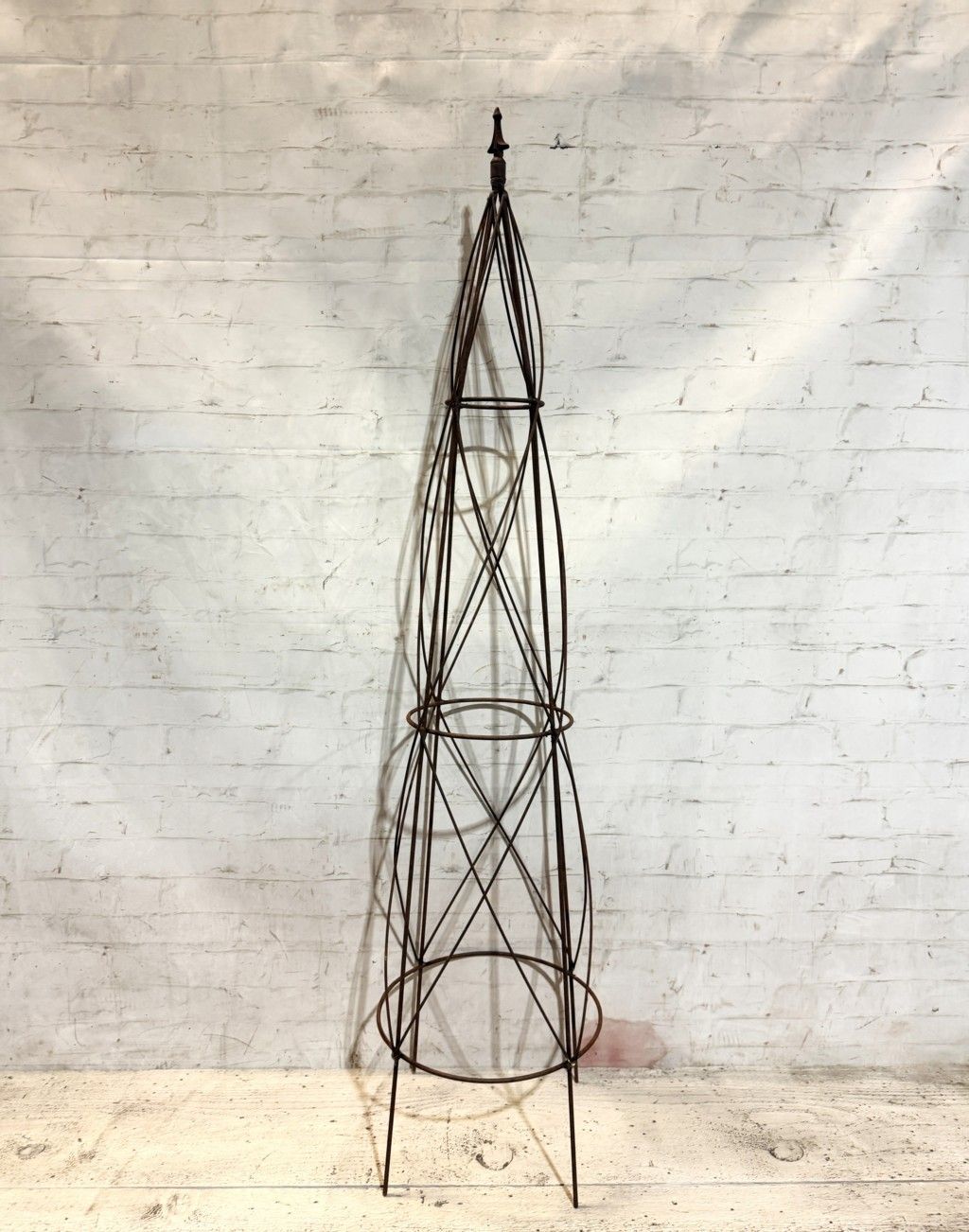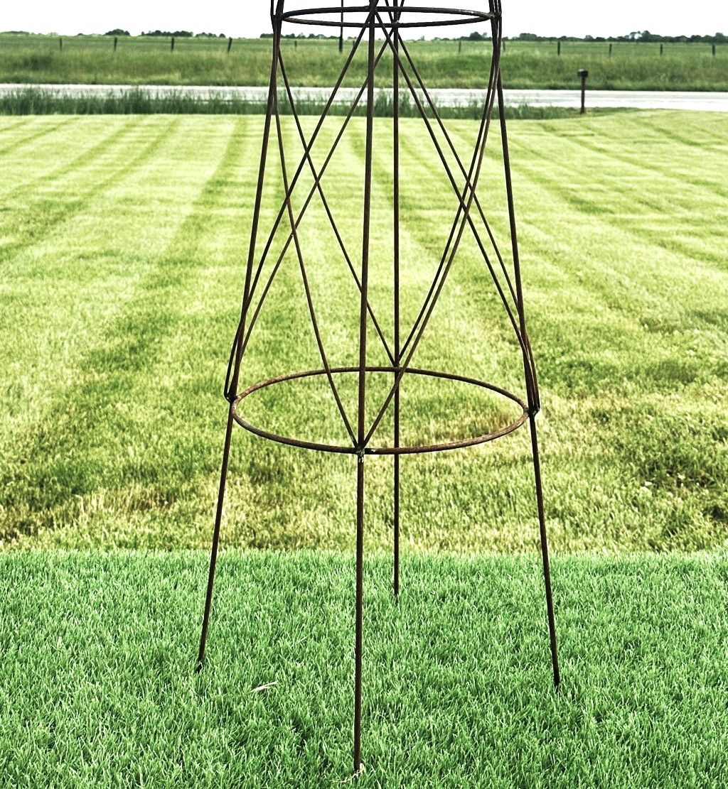 Large Beehive Topiary Form creates a tall iron garden obelisk for climbing plants. Made by welding steel rod around to get this great plant support. Measures 58" tall by 13" diameter at the bottom.