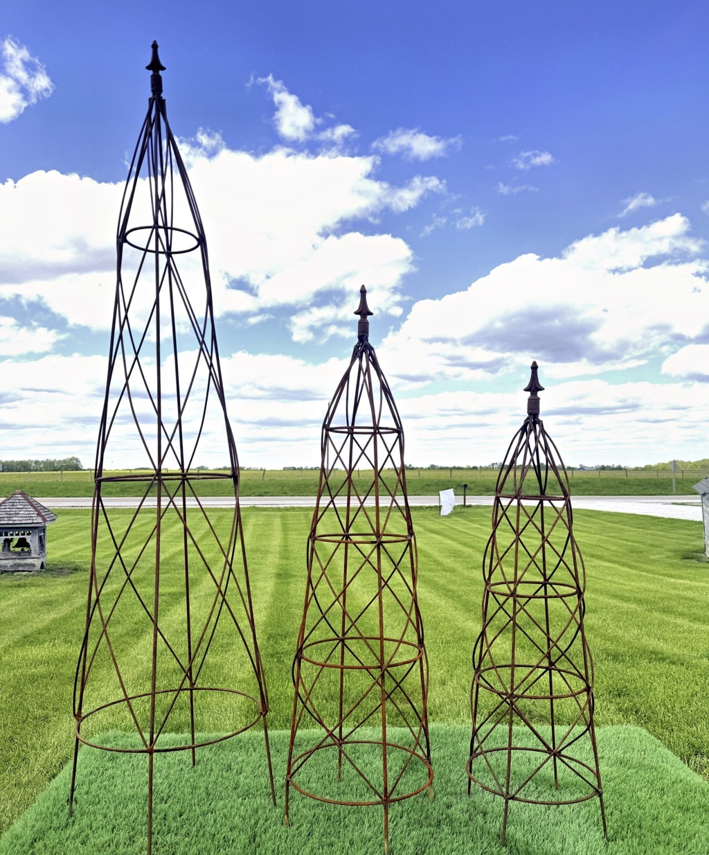 Large Beehive Topiary Form creates a tall iron garden obelisk for climbing plants. Made by welding steel rod around to get this great plant support. Measures 58" tall by 13" diameter at the bottom.