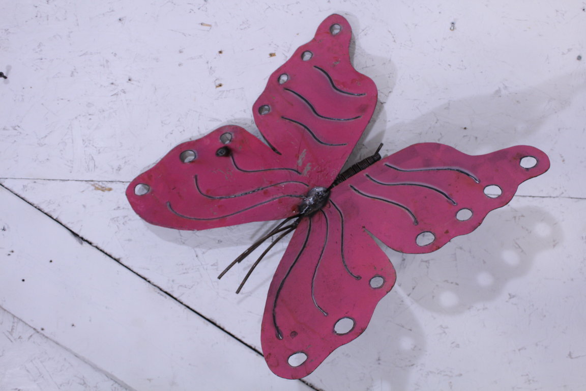 Hang these pink and green butterflies on a fence or a wall. You get one butterfly but you need to consider a pair for the color. Measures 17" tall x 16" wide.