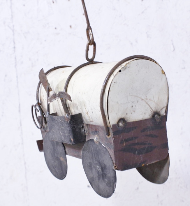 This rustic metal birdhouse is for all you cowboys and cowgirls out there. You can hang this covered wagon out on your porch, deck or from a tree so your birds will have a home on the range. Measures 8" tall x 9" long.