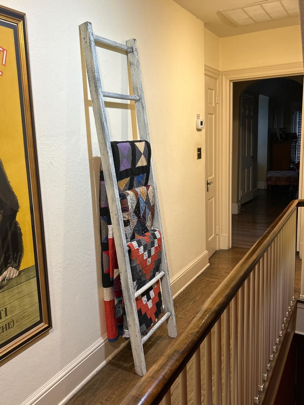 Our country barn ladders are great for decorating your home. I hang my antiques quilts but they work well for towels and blankets also. In order to ship this tall 7' ladder it needs to be narrow. Expect it to be around 17" - 23" wide.