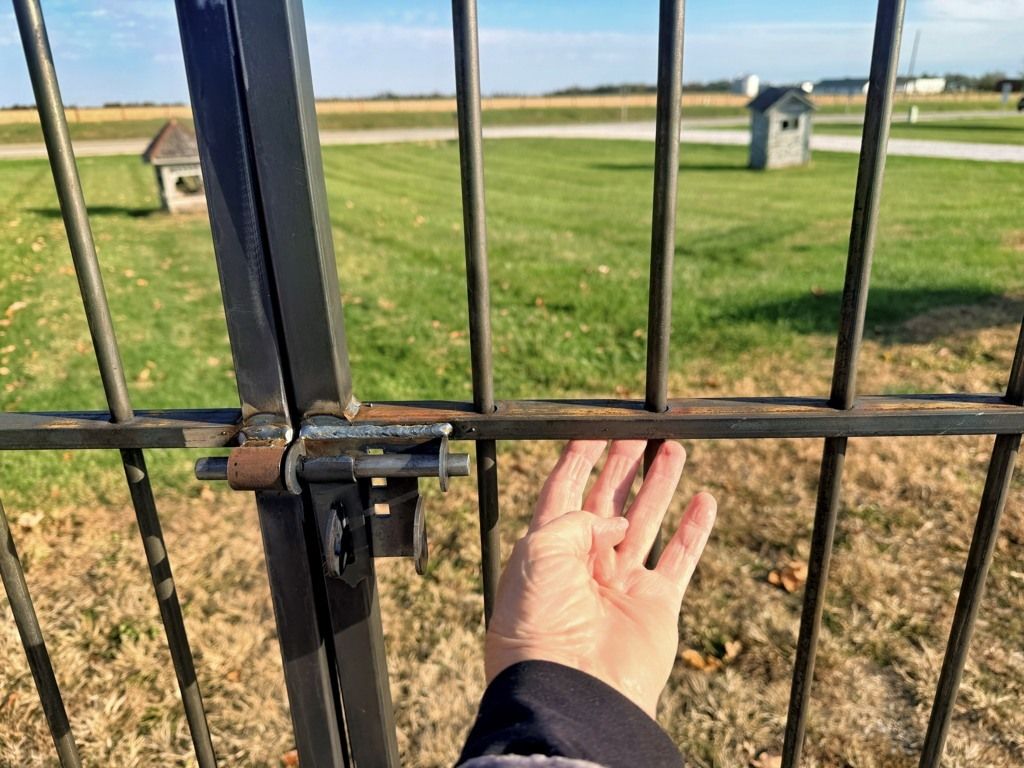 We have changed this large double Des Moines gate that is constructed here in middle Illinois using 1" square steel tube stock for strength and measures close to 5' tall at the sides and fits a 10' wide opening.