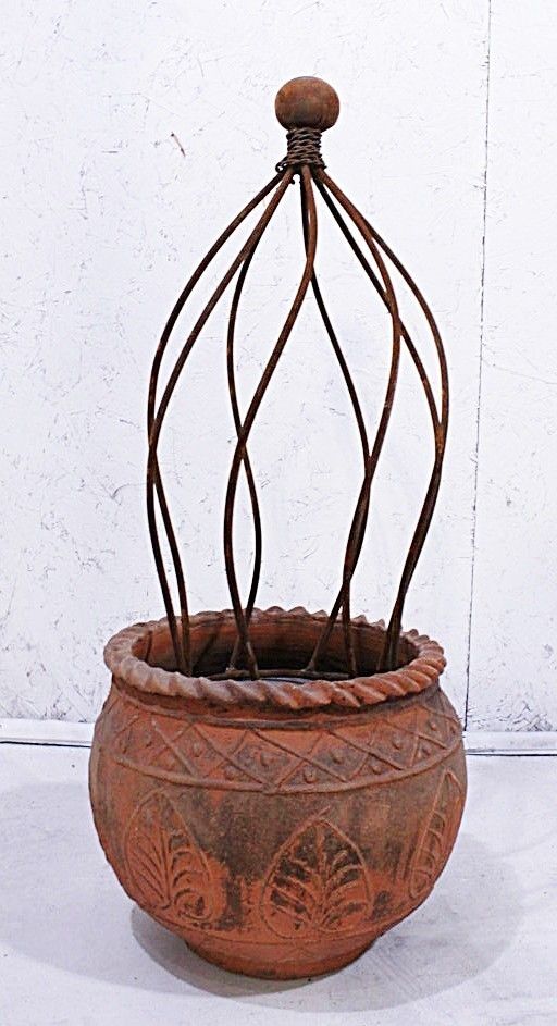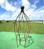 This small iron topiary will hold up a climbing flower or vine in your garden. You can place them in a pot and decorate your front door or patio. Measures 24" tall, 20" after staking, x 9.5" diameter. The ring at the bottom is 7" diameter.