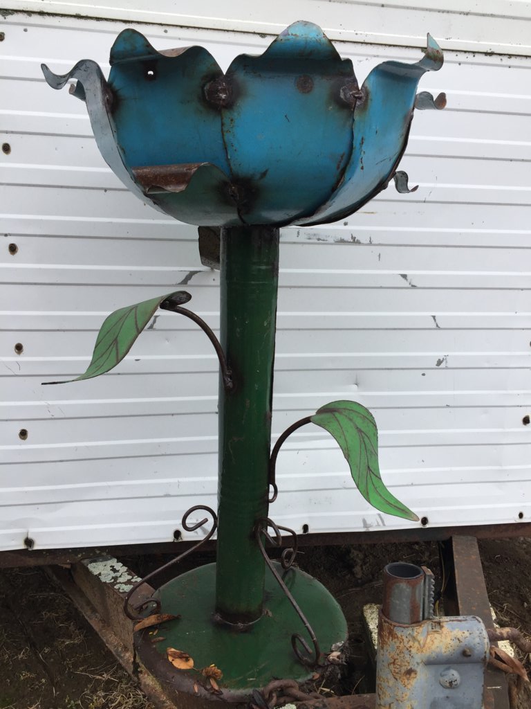 This is the small metal flower plant stand. We have 4 colors to choose from, and these folk art planters could accent your porch, patio, or back yard. Made from recycled metal, they will hold your favorite flowers. Watch them bloom up and over the side of the bowl. Measures 20" tall x 18" diameter x 13.5" diameter on the inside x 6" deep.