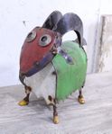 This colorful small metal mountain goat can live in your backyard with all your other animals. We have 3 sizes in these goats. The other 2 are in other listings. Measures 10" tall x 9" long x 4" wide. Colors will vary as these are handmade.