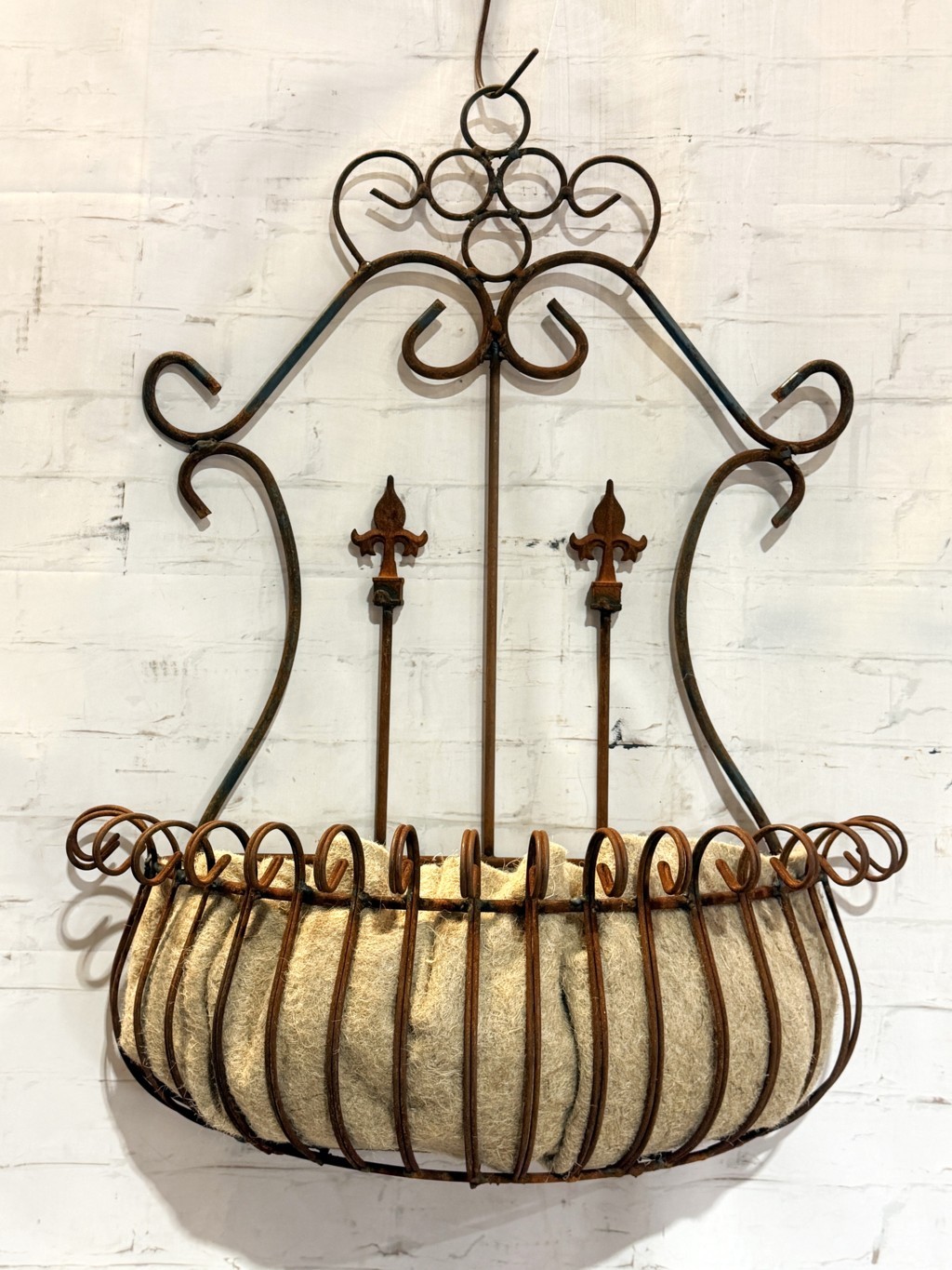 This Curl Spear Wall Planter has style. The welded wrought iron makes it pop on your patio. Measures 25" tall by 23" wide by 12" out from the wall.