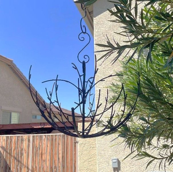 This is a wrought iron tree that could hang your collectibles like organizing your necklaces and jewelry. Hang it from your deck, patio or a tree for your birdfeeders or birdhouses. Measures 18" tall x 29" wide. Welded steel limbs with metal twigs.