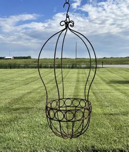 This sturdy large metal hanging container will showcase your favorite flowers in a beautifully designed basket Its elegant design adds a touch of sophistication, while providing a practical way to display your greenery and trailing flowers. Ideal for any home gardener looking to elevate their outdoor decor. Bring life to your balcony or garden with this delightful addition! Measures 42" tall with hook, 38" without hook x basket 18" diameter, 14" inside x 11" deep